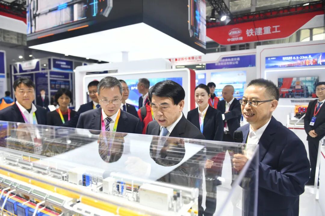 湖南省副省長蔣滌非(右二)、株洲市市長陳恢清(右三)參觀鐵建重工展臺,鐵建重工黨委常委、副總經理、工會主席譚光勇(右一)講解
